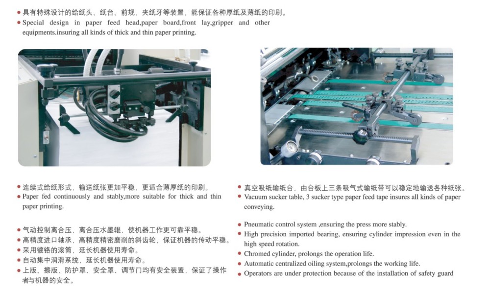 A2 Lau koloreko tirada laburreko inprimaketa offset inprimaketari dagokionez, fidagarri bihurtzen duten errendimendu handiko moduluekin eraikita dago, epe laburreko inprimaketa lanetarako aproposa. Modulu hauek zehaztasun handiko arrabolak eta engranajeak, papera elikatzeko mekanismo sendoa, papera erregistratzeko sistema zehatza eta tinta hornitzeko sistema egonkorra dira. Kalitate handiko, eraginkorra eta errentagarria den kolore moztutako orrien inprimatzeko merkatuaren beharrak asetzen ditu, batez ere tirada laburreko lanetarako. Paperaren lodiera ugari kudea ditzake: 0,04 mm-ko paper mehetik 0,4 mm-ko kartoiraino. Eta ukipen-pantailaren kontrolarekin eta programazio-interfaze intuitiboarekin, ezarpen eta inprimatze-parametro guztietan doikuntza adimendunak erraz egin ditzakezu.