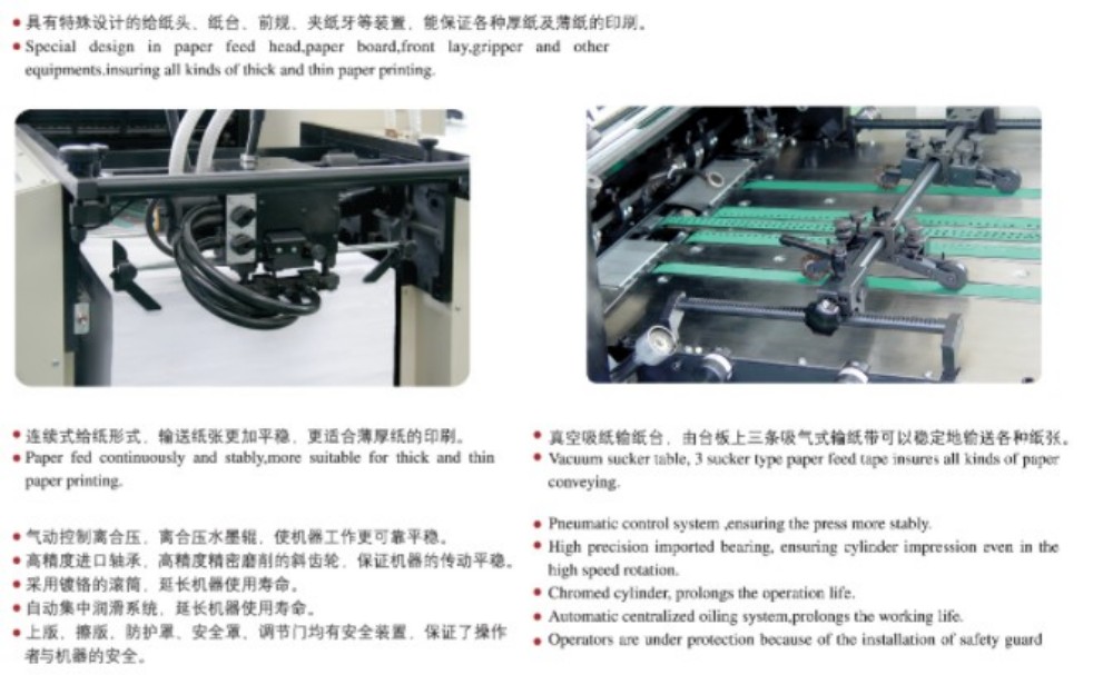 A3 lau koloretako ontzien inprimaketa offset inprimaketa errendimendu handiko moduluekin diseinatuta dago, eta guztiak kalitate goreneko dira: doitasun handiko arrabolak eta engranajeak, papera elikatzeko mekanismo sendoa, zehaztasun handiko papera erregistratzeko sistema eta tinta hornitzeko sistema egonkorra. Kalitate handiko, eraginkorra eta merkea den ebakitako koloretako inprimatzeko merkatuaren eskakizunak betetzeko egokituta dago. Ez duzu paperaren lodiera bakarrari eutsi beharrik ere: paper mehearekin (0,04 mm) eta kartoi lodiarekin (0,4 mm) funtzionatzen du. Ukipen-pantailaren kontrola ere badago, programazio-interfaze intuitibo batekin, ezarpenak eta inprimatzeko parametroak modu adimendun eta zuzen batean doitzeko aukera ematen dizu.
